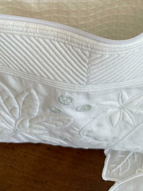 Au passage, admirez les rosettes et ce qui semble être des points d’œillet. Le tout sur une batiste d’un blanc éclatant.